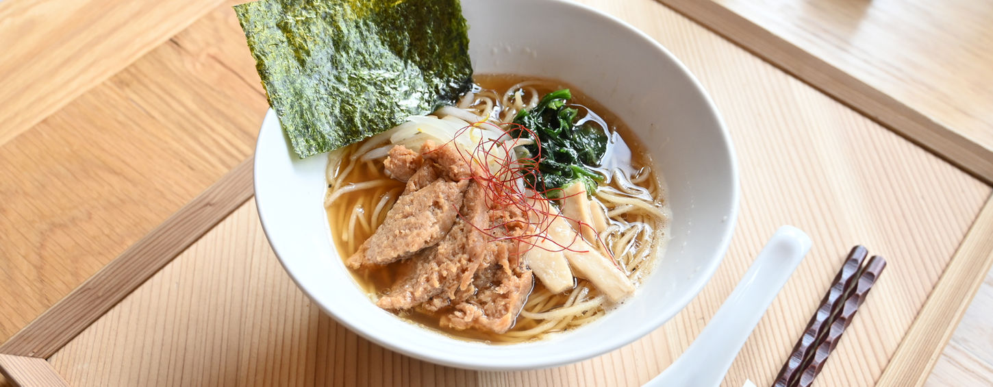 This ramen is made without animal products, flour or additives. The noodles are made from several millet grains. It is topped with soy meat in a gluten-free soy sauce and kelp broth.